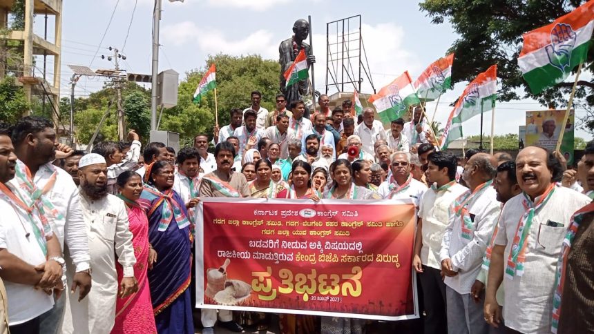 ಗದಗ: ಕೇಂದ್ರ ಬಿಜೆಪಿ ಸರ್ಕಾರ ರಾಜ್ಯಕ್ಕೆ ಹೆಚ್ಚುವರಿ ಅಕ್ಕಿ ನೀಡದೆ ರಾಜಕೀಯ ಮಾಡುತ್ತಿದೆ ಎಂದು ಆರೋಪಿ ನಗರದಲ್ಲಿ ಕಾಂಗ್ರೆಸ್ ಕಾರ್ಯಕರ್ತರು ಗಾಂಧೀ ವೃತ್ತದಲ್ಲಿ ಪ್ರತಿಭಟನೆ ಮಾಡಿದರು.