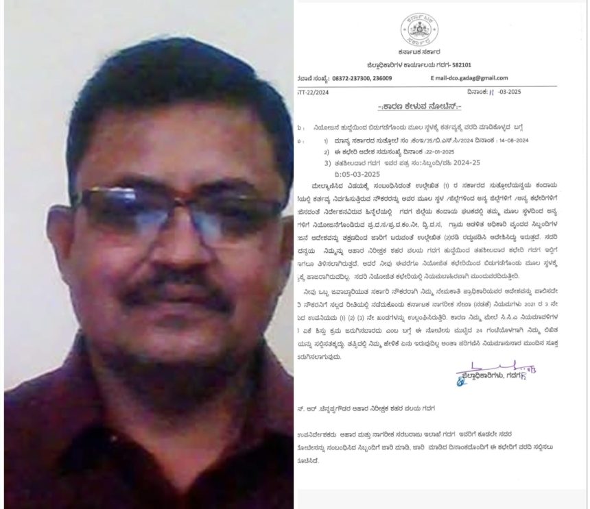 ನೀವು ಒಬ್ಬ ಜವಾಬ್ದಾರಿಯುತ ಸರ್ಕಾರಿ ನೌಕರರಾಗಿ ನಿಮ್ಮ ನೇಮಕಾತಿ ಪ್ರಾಧಿಕಾರಿಯವರ ಆದೇಶವನ್ನು ಪಾಲಿಸದೇ ಸರ್ಕಾರಿ ನೌಕರನಿಗೆ ಸಲ್ಲದ ರೀತಿಯಲ್ಲಿ ನಡೆದುಕೊಂಡು ಕರ್ನಾಟಕ ನಾಗರೀಕ ಸೇವಾ (ನಡತೆ) ನಿಯಮಗಳು 2021 ರ 3 ನೇ ನಿಯಮದ ಉಪನಿಯಮ (1) (2) (3) ನೇ ಖಂಡಗಳನ್ನು ಉಲ್ಲಂಘಿಸಿರುತ್ತಿರಿ. ಕಾರಣ ನಿಮ್ಮ ಮೇಲೆ ಸಿ.ಸಿ.ಎ ನಿಯಮಾವಳಿಗಳ ಪ್ರಕಾರ ಏಕೆ ಶಿಸ್ತು ಕ್ರಮ ಜರುಗಿಸಬಾರದು ಎಂಬ ಬಗ್ಗೆ ಈ ನೋಟೀಸು ಮುಟ್ಟಿದ 24 ಗಂಟೆಯೊಳಗಾಗಿ ನಿಮ್ಮ ಲಿಖಿತ ಹೇಳಿಕೆಯನ್ನು ಸಲ್ಲಿಸತಕ್ಕದ್ದು, ತಪ್ಪಿದಲ್ಲಿ ನಿಮ್ಮ ಹೇಳಿಕೆ ಏನು ಇರುವುದಿಲ್ಲ ಅಂತಾ ಪರಿಗಣಿಸಿ ನಿಯಮಾನುಸಾರ ಮುಂದಿನ ಸೂಕ್ತ ಕ್ರಮ ಜರುಗಿಸಲಾಗುವುದು ಎಂದು ನೋಟಿಸು ನೀಡಿದ್ದಾರೆ.