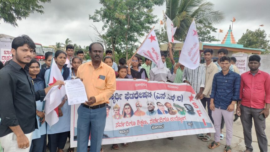 ಈ ಸಂದರ್ಭದಲ್ಲಿ ಎಸ್ ಎಫ್ ಐ ಜಿಲ್ಲಾಧ್ಯಕ್ಷರಾದ ಚಂದ್ರು ರಾಠೋಡ ಮಾತನಾಡಿ ರಾಜ್ಯ ಸರ್ಕಾರ ಶಕ್ತಿ ಯೋಜನೆ ಮಾಡಿ ಎಲ್ಲರಿಗೂ ಉಚಿತ ಬಸ್ ವ್ಯವಸ್ಥೆ ಘೋಷಣೆ ಮಾಡಿದೆ ಆದರೆ ಸಮಯಕ್ಕೆ ಸರಿಯಾಗಿ ಬಸ್ ಇಲ್ಲ ಹೊಸ ಬಸ್ಸಗಳು ಖರಿದಿಯಾಗಿಲ್ಲ, ಗ್ರಾಮೀಣ ಪ್ರದೇಶದ ವಿದ್ಯಾರ್ಥಿಗಳಿಗೆ ಮೂಲಭೂತ ಸೌಕರ್ಯಗಳನ್ನು ಸರಿಯಾಗಿ ಒದಗಿಸಿದೆ ಗ್ರಾಮೀಣ ಭಾಗದ ವಿದ್ಯಾರ್ಥಿಗಳನ್ನ ರಾಜ್ಯ ಹಾಗೂ ಕೇಂದ್ರ ಸರ್ಕಾರಗಳು ಕಡೆಗಣಿಸುತ್ತಿದ್ದೆ. ಊರಿನಿಂದ ಸುಮಾರು 100 ಜನ ವಿದ್ಯಾರ್ಥಿಗಳು ಶಿಕ್ಷಣ ಪಡೆಯಲು ಗಜೇಂದ್ರಗಡ ನಗರಕ್ಕೆ ದಿನ ನಿತ್ಯ ಬರುತ್ತಿದ್ದಾರೆ ಆದರೆ ಅವರಿಗೆ ಸರಿಯಾದ ಬಸ್ ವ್ಯವಸ್ಥೆ ಇಲ್ಲದೆ ಸಮಯಕ್ಕೆ ಸರಿಯಾಗಿ ತರಗತಿ ಹಾಜರಾಗಲು ಆಗುತ್ತಿಲ್ಲ, ಗ್ರಾಮೀಣ ಪ್ರದೇಶದ ವಿದ್ಯಾರ್ಥಿಗಳು ಶಿಕ್ಷಣದಿಂದ ವಂಚಿತರಾಗುತ್ತಿದ್ದಾರೆ. ಶೈಕ್ಷಣಿಕ ವರ್ಷ ಆರಂಭವಾಗಿ ಸುಮಾರು ಎರಡೂವರೆ ತಿಂಗಳು ಕಳೆದರೂ ಕೂಡ ಸರ್ಕಾರಿ ಶಾಲಾ ,ಕಾಲೇಜುಗಳಲ್ಲಿ ಸರಿಯಾಗಿ ಮೂಲಭೂತ ಸೌಕರ್ಯಗಳನ್ನು ಸರಿಯಾಗಿ ಕಲ್ಪಿಸಿಲ್ಲ, ಹಾಸ್ಟೆಲ್ ಗೆ ಅರ್ಜಿ ಸಲ್ಲಿಸಿದ ಎಲ್ಲಾ ವಿದ್ಯಾರ್ಥಿಗಳಿಗು ಕೂಡ ಹಾಸ್ಟೆಲ್ ಸಿಗಬೇಕು ಅಂತ ಎಸ್ ಎಫ್ ಐ ಸಂಘಟನೆ ಒತ್ತಾಯಿಸುತ್ತದೆ. ಆದ ಕಾರಣ ಸಂಬಂಧಪಟ್ಟ ಅಧಿಕಾರಿಗಳು, ಹಾಗೂ ಶಾಸಕರು ಈ ಕೂಡಲೇ ಗಜೇಂದ್ರಗಡ ತಾಲೂಕಿನ ನೇಲ್ಲೂರ ಗ್ರಾಮಕ್ಕೆ ಬಸ್ ವ್ಯವಸ್ಥೆ ಕಲ್ಪಿಸಿಕೊಡಬೆಕೆಂದು ಒತ್ತಾಯಿಸುತ್ತಿದ್ದೆವೆ , ಬಸ್ ಬಿಡದೆ ಇದ್ದ ಪಕ್ಷದಲ್ಲಿ ಮುಂದಿನ ದಿನಗಳಲ್ಲಿ ತಿವ್ರ ಸ್ವರೂಪದ ಹೋರಾಟವನ್ನು ರೂಪಿಸಬೇಕಾಗುತ್ತದೆ ಎಂದು ಎಚ್ಚರಿಸಿದರು.